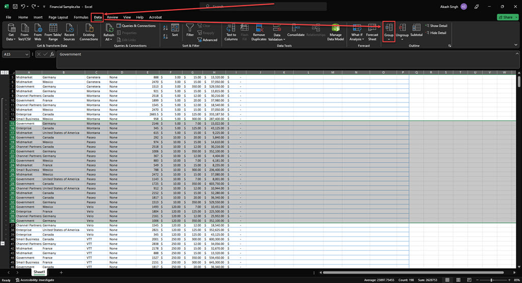- Group by Region: Select all the rows for a particular region (e.g., all rows for the “North” region). Group these rows. Repeat for each region. Now you can collapse and expand the sales data for each region independently.