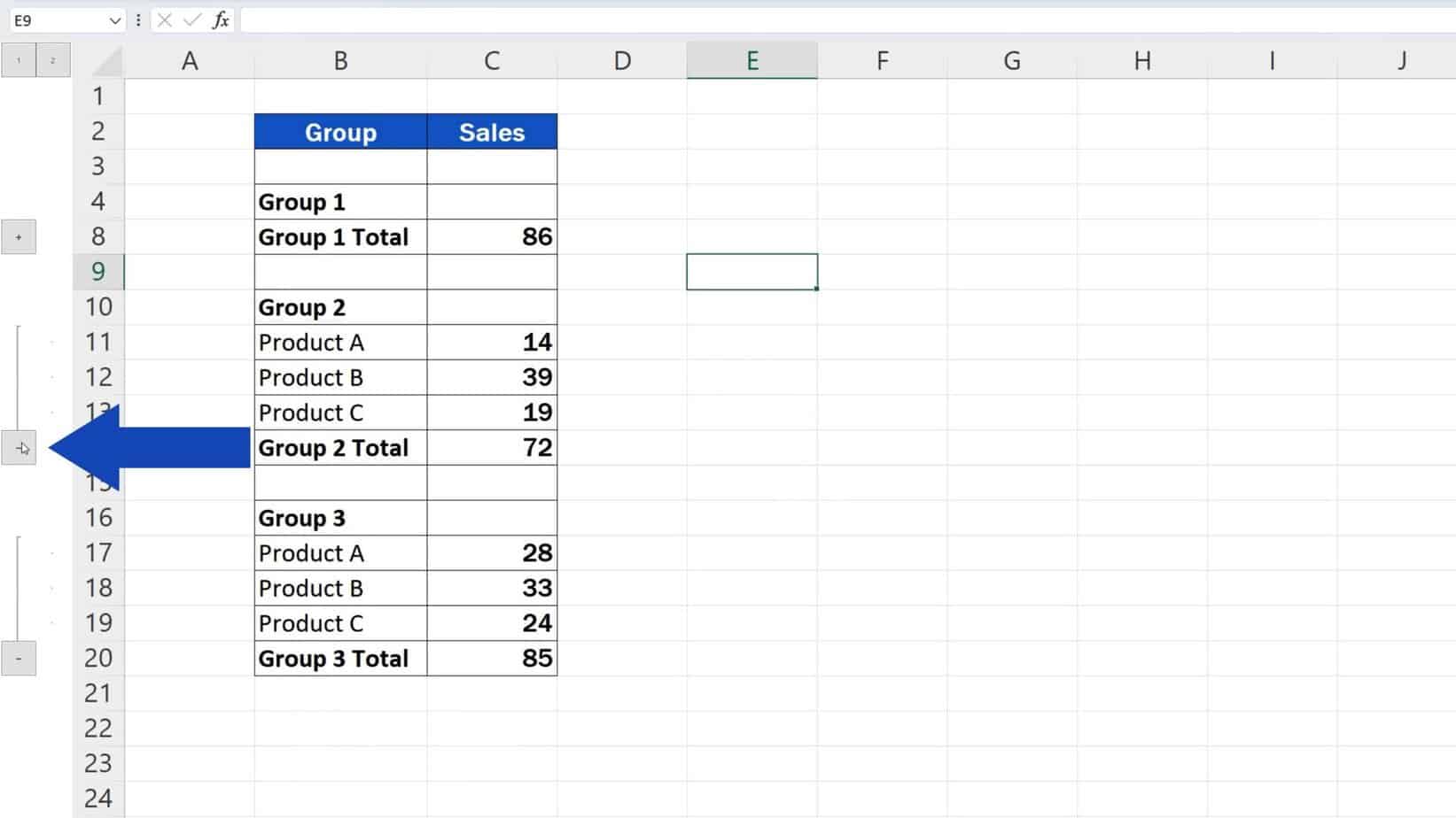 - Clicking the minus sign will collapse the group, hiding the selected rows. The button will change to a plus sign (+), indicating that the group can be expanded.