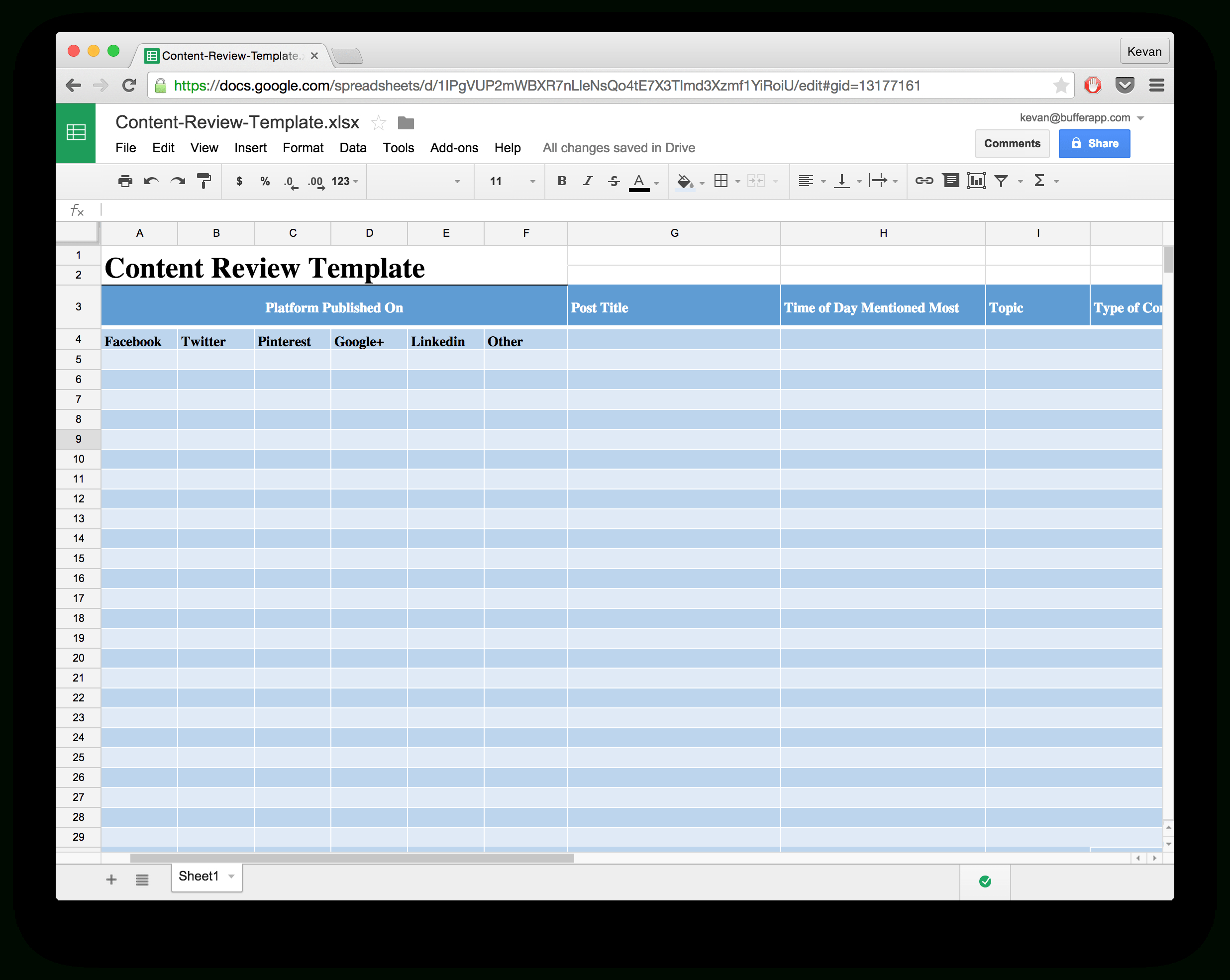 Organize your spreadsheet into separate sheets for each platform you’re tracking (e.g., Facebook, Instagram, Twitter, LinkedIn). Within each sheet, create columns for: