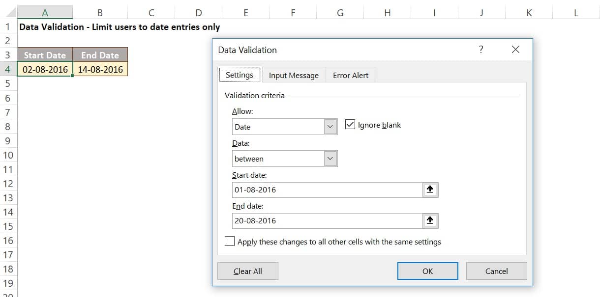 - In the Data Validation dialog box, click on the “Clear All” button.