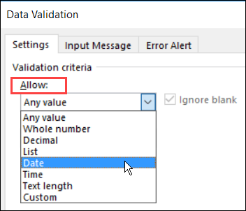 - Choose Date as the Validation Criteria: In the Data Validation dialog box, go to the “Settings” tab. In the “Allow” dropdown menu, select “Date.”